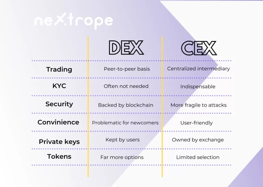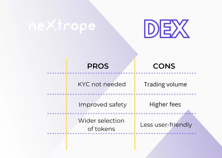 DEX : Plus de liberté, mais moins de régulation. Les DEX, opérant en réseau de pair à pair, échappent souvent à la plupart des régulations traditionnelles.